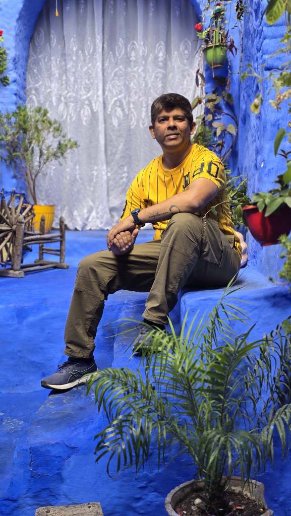 As Hameed started moving ahead, we time-traveled from history to the present world reality. However, it appears much hasn’t changed. The city looked oblivious to the modern world, and it seemed time had stopped here. The traditional building structures painted in indigo, the quiet lanes, and blue colored steps going up and down transport you to the old world! It looked so neatly arranged as if it’s a movie set. So much so that my film producer friend, who was constantly on calls, had to take his colleagues on video call to show the city and make them realize this is how a set is built!